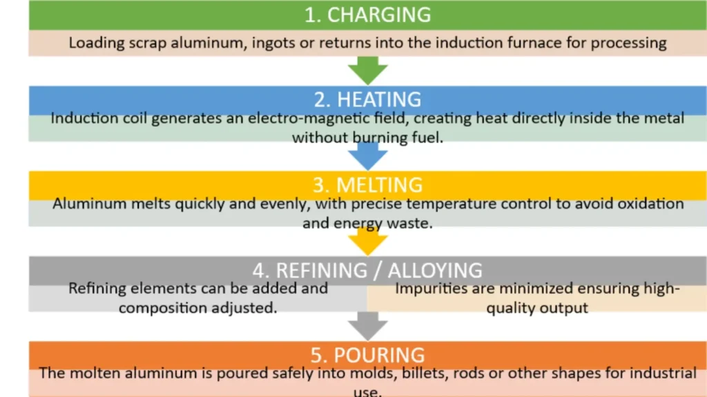 Los hornos de inducción consumen menos energía por tonelada de aluminio que los hornos de combustible. Los sistemas de inducción de frecuencia media logran una alta eficiencia y velocidades de fusión rápidas, lo que ahorra costos operativos.