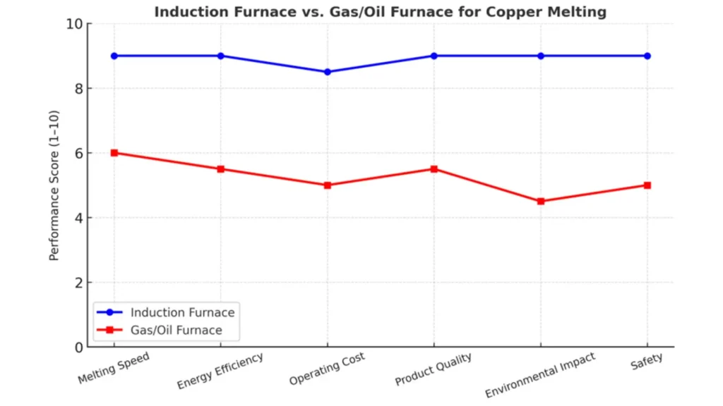 Como se ilustra arriba, un sistema de fusión de cobre con horno de inducción supera a los hornos de gas o petróleo en todas las métricas de rendimiento clave, incluidas la eficiencia, la seguridad y la calidad del producto.
