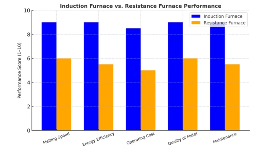 Este gráfico destaca cómo los hornos de inducción superan a los hornos de resistencia en todas las áreas críticas, desde la velocidad de fusión hasta la seguridad, lo que confirma sus ventajas en las operaciones industriales. En general, las ventajas del horno de inducción sobre el horno de resistencia se vuelven aún más evidentes cuando se evalúan el ahorro de energía a largo plazo, la calidad del metal y los requisitos de mantenimiento.
