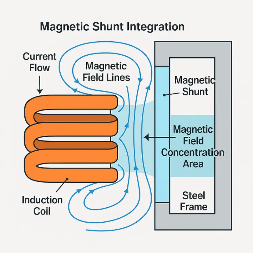 En sistemas avanzados de hornos de inducción con estructura de acero, también conocidos como hornos con desvío magnético (magnetic shunted furnaces), se utilizan flejes magnéticos para dirigir y concentrar el campo magnético alrededor de la bobina de inducción. Estos componentes magnéticos blandos laminados sirven para:
