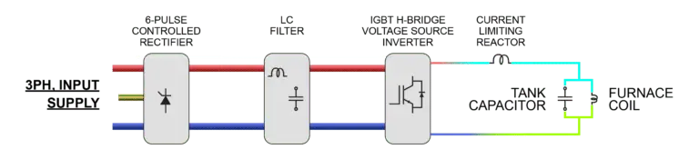 Suministro de entrada – La fuente de energía es un convertidor estático de frecuencia de línea a frecuencia media/alta. Normalmente, la energía industrial está disponible en frecuencia de línea, trifásica. Sin embargo, los hornos de inducción requieren energía de alta frecuencia para alimentar a la bobina de inducción para aplicaciones de calentamiento/fusión.